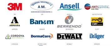 Hacemos sinergia con marcas líderes en el mercado nacional, tales como: 3M, AM, ADEX, ANSELL, ANTIESTATICS, ARMADA, ALYGER, BANOM, BERRENDO, PROCLIFF, CORDOVA, DERMA CARE, DEWALT, DRAGER, DUPONT, DURAMAX, ENCON, ELVEX, FIBRE METAL, FONIC, GALGO, GOLDEN EAGLE, GUANTES INTERNACIONALES, GREEN STUFF, GUMA, GVS, HERHILD, HEXARMOR, HONEYWELL, HOWARD LEIGHT, IDRA POWER, INFRA, JACKSON SAFETY, JYRSA, KALSO, KIMBERLY CLARK, LIBUS, MILLER, MSA, NORTH, PIP, RADIANS, ROMAK, SAFE-FIT, SAFETY ZONE, SERVUS, SKOLD, SUPERIOR GLOVE, TUK, UVEX, VI4, WARTHOG, WEST CHESTER, entre otras.